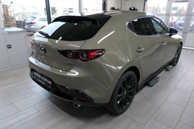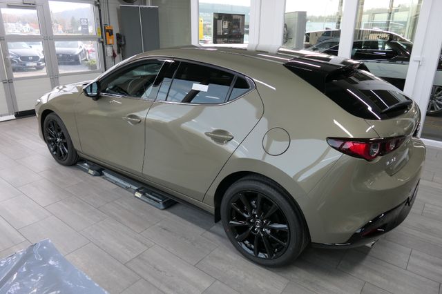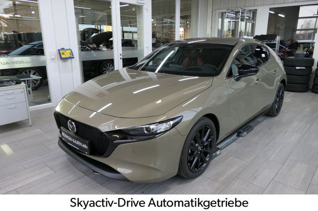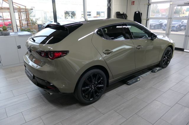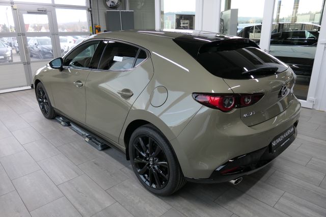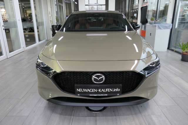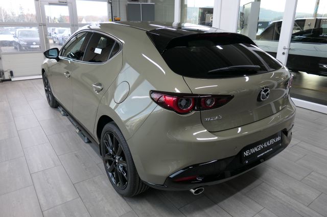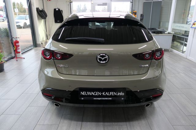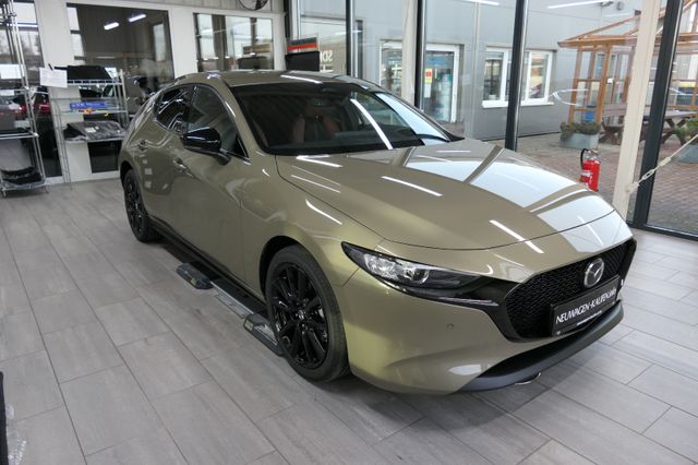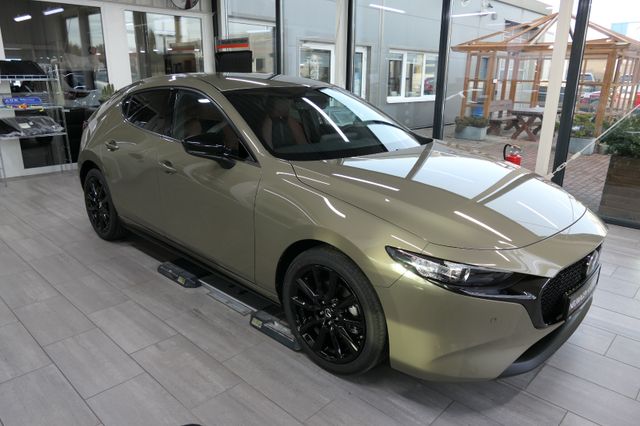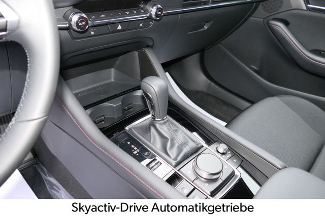 18-Zoll-Leichtmetallfelgen in Schwarz, A-/B-Säulenverkleidung mit Hochglanzfinish, Klimatisierungsautomatik, Mazda Connect mit 10,25 Zoll Display, Frontairbag, Heck- und Seitenscheiben hinten abgedunkelt, Airbags: Kopf-/ Schulter-Airbag vorne und hinten; Seitenairbag vorne; Frontairbags, Knie-Airbag für Fahrer, Beifahrer-Airbag-Deaktivierung, Freisprecheinrichtung mit Sprachsteuerung und Bluetooth® mit Audio-Streaming, Notbrems-Warnblinkautomatik (ESS), Digitalradio-Tuner (DAB+), Auto Door Lock, Rückfahrkamera, Auspuffanlage, zweiflutig, Mazda SD-Navigationssystem, Innenrückspiegel automatisch abblendend, Sport- oder Normal-Modus (nur i.V.m. Skyactiv-Drive Automatikgetriebe), Spurwechselassistent Plus (BSM) und Ausparkhilfe (RCTA), Advanced Head-up Display, Wireless Apple Carplay und Wireless Android Auto, Elektronische Parkbremse mit Auto-Hold Funktion, Qi: Induktives Laden (für kompatible Smartphones), Alarmanlage, ISOFIX® Kindersitzhalterung für die äußeren Sitze, hinten, Mittelarmlehne, vorne mit 2 USB-C-Anschlüssen, Geschwindigkeitsregelanlage mit Geschwindigkeitsbegrenzer, Fernlichtassistent (HBC), Fahrer- und Beifahrersitz höheneinstellbar (Einstellung der Neigung für den Fahrersitz), Müdigkeitserkennung (DAA), Berganfahrassistent (HLA), Beleuchtetes Handschuhfach, Dekorelemente in Gunmetal-Schwarz, Dynamische Stabilitätskontrolle (DSC), Leselampen, vorne, Voll-LED-Scheinwerfer mit automatischer Leuchtweitenregulierung, LED-Rückleuchten und Blinker, Halogen-Tagfahrlicht, LED-Innenraum- und Kofferraumbeleuchtung, Wegfahrsperre, elektronisch, Komfortblinkfunktion, Geschwindigkeitsbegrenzer mit Komfortschaltung (ISA), Memory-Funktion für Fahrersitz, Head-up Display und Außenspiegel, 3-Speichen-Sport-Lederlenkrad, Außenspiegel automatisch abblendend (Fahrerseite), Einparkhilfe, vorne und hinten, Adaptive Geschwindigkeitsregelanlage mit Stauassistenzfunktion (i.V.m. Skyactiv-Drive Automatik) (MRCC), Frontgrill in Schwarz glänzend, Zentralverriegelung mit Funkfernbedienung, Notbremsassistent (SBS) mit Fußgänger- und Radfahrererkennung, Dachheckspoiler in Schwarz, LogIn: Schlüsselloses Zugangssystem, Elektrische Fensterheber, vorne und hinten, mit Komfortfunktion, Mittelarmlehne, hinten, Gurtstraffer mit Gurtkraftbegrenzer, vorne und hinten außen, Rücksitzlehnen im Verhältnis 60:40 geteilt klappbar, Regensensor, Warnleuchte und -ton für nicht angelegte Sicherheitsgurte, Reifendruckkontrollsystem, direkt (TPMS), Mobilitäts-Kit mit Kompressor und Reifendichtmittel, Motor Start-/Stop-Knopf, Lenkradbedientasten für Audioquelle und Lautstärke, Freisprechanlage und Geschwindigkeitsregelanlage, Make-up-Spiegel für Fahrer und Beifahrer, Lenksäule längeneinstellbar, Lenksäule höheneinstellbar