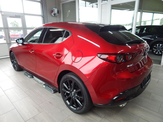 18-Zoll-Leichtmetallfelgen in Schwarz, A-/B-Säulenverkleidung mit Hochglanzfinish, Klimatisierungsautomatik, Digitalradio-Tuner (DAB+) und Mazda Connect mit 10,25 Zoll Display, Frontairbag, Heck- und Seitenscheiben hinten abgedunkelt, Airbags: Kopf-/ Schulter-Airbag vorne und hinten; Seitenairbag vorne; Frontairbags, Knie-Airbag für Fahrer, Beifahrer-Airbag-Deaktivierung, Freisprecheinrichtung mit Sprachsteuerung und Bluetooth® mit Audio-Streaming, Notbrems-Warnblinkautomatik (ESS), Digitalradio-Tuner (DAB+), Auto Door Lock, Rückfahrkamera, Auspuffanlage, zweiflutig, Mazda SD-Navigationssystem, Innenrückspiegel automatisch abblendend, Sport- oder Normal-Modus (nur i.V.m. Skyactiv-Drive Automatikgetriebe), Spurwechselassistent Plus (BSM) und Ausparkhilfe (RCTA), Advanced Head-up Display, Wireless Apple Carplay und Wireless Android Auto, Elektronische Parkbremse mit Auto-Hold Funktion, Qi: Induktives Laden (für kompatible Smartphones), Alarmanlage, ISOFIX® Kindersitzhalterung für die äußeren Sitze, hinten, Mittelarmlehne, vorne mit 2 USB-C-Anschlüssen, Geschwindigkeitsregelanlage mit Geschwindigkeitsbegrenzer, Fernlichtassistent (HBC), Fahrer- und Beifahrersitz höheneinstellbar (Einstellung der Neigung für den Fahrersitz), Müdigkeitserkennung (DAA), Berganfahrassistent (HLA), Beleuchtetes Handschuhfach, Dynamische Stabilitätskontrolle (DSC), Leselampen, vorne, Voll-LED-Scheinwerfer mit automatischer Leuchtweitenregulierung, LED-Rückleuchten und Blinker, Halogen-Tagfahrlicht, LED-Innenraum- und Kofferraumbeleuchtung, Wegfahrsperre, elektronisch, Komfortblinkfunktion, Geschwindigkeitsbegrenzer mit Komfortschaltung (ISA), 3-Speichen-Sport-Lederlenkrad, Einparkhilfe, vorne und hinten, Adaptive Geschwindigkeitsregelanlage (MRCC), Frontgrill in Schwarz glänzend, Zentralverriegelung mit Funkfernbedienung, Notbremsassistent (SBS) mit Fußgänger- und Radfahrererkennung, Dachheckspoiler in Schwarz, LogIn: Schlüsselloses Zugangssystem, Elektrische Fensterheber, vorne und hinten, mit Komfortfunktion, Mittelarmlehne, hinten, Gurtstraffer mit Gurtkraftbegrenzer, vorne und hinten außen, Rücksitzlehnen im Verhältnis 60:40 geteilt klappbar, Regensensor, Warnleuchte und -ton für nicht angelegte Sicherheitsgurte, Reifendruckkontrollsystem, direkt (TPMS), Mobilitäts-Kit mit Kompressor und Reifendichtmittel, Motor Start-/Stop-Knopf, Lenkradbedientasten für Audioquelle und Lautstärke, Freisprechanlage und Geschwindigkeitsregelanlage, Make-up-Spiegel für Fahrer und Beifahrer, Lenksäule längeneinstellbar, Lenksäule höheneinstellbar