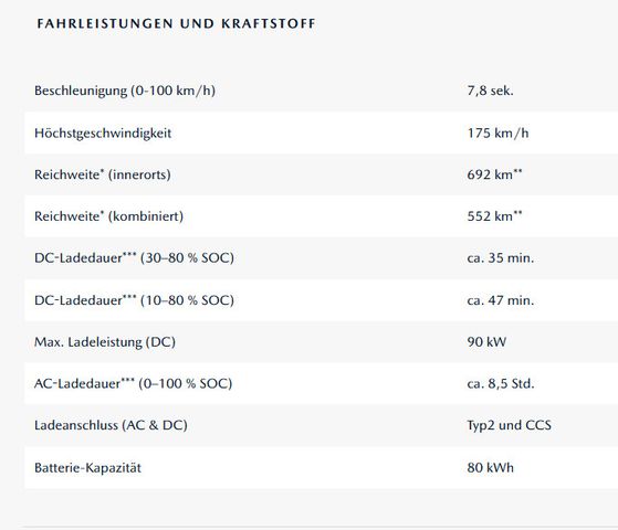 Adaptive Geschwindigkeitsregelanlage mit Stauassistenzfunktion, Geschwindigkeitsregelanlage, Alarmanlage, Berganfahrassistent, LogIn: Schlüsselloses Zugangssystem, Dynamische Stabilitätskontrolle, Erweiterte Lenkunterstützung, Fahrmodi: Normal, Sport und Individual, Typ-2-Ladekabel (20 A) für Ladestationen (Mode 3). Länge 4 m, Fernlichtassistent, Elektrische Parkbremse mit Auto-Hold-Funktion, Kollisionswarner für den hinteren Querverkehr, Kollisionswarner, hinten und vorne, Notbremsassistent hinten inkl. des hinteren Querverkehrs, Notbremsassistent vorne, Notfall-Spurhalteassistent mit Lenkunterstützung, Spurwechselassistent, Spurwechselwarner, Verkehrszeichenerkennung, Geschwindigkeitswarner, Türöffnungswarnung, System zur Erkennung von Kindern im Fahrzeug, Coming-/ Leaving-Home Lichtfunktion, 9 Airbags inkl. Centerairbag vorne
