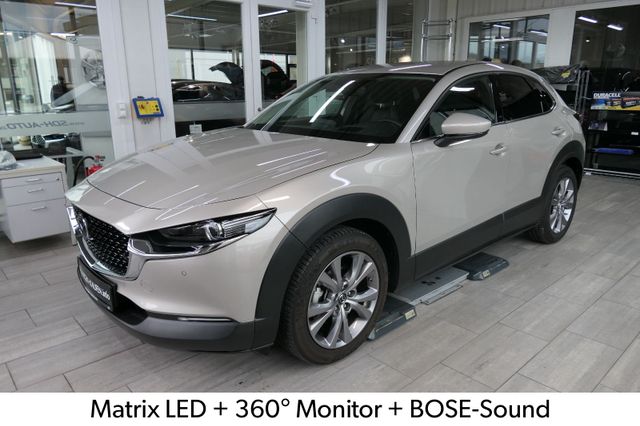 Sport- oder Normal-Modus (nur i.V.m. Skyactiv-Drive Automatikgetriebe), Elektronische Parkbremse mit Auto-Hold Funktion, Motor-Start-/Stopp-Knopf mit Chromapplikation, Rahmenloser Innenspiegel, Mittelarmlehne, vorne mit 2 USB-C-Anschlüssen, Fahrer- und Beifahrersitz höheneinstellbar (Einstellung der Neigung für den Fahrersitz), Beleuchtetes Handschuhfach, Leselampen, vorne, LED-Innenraum- und Kofferraumbeleuchtung, 3-Speichen-Sport-Lederlenkrad mit Schaltwippen (bei SKYACTIV-Drive Automatikgetriebe), Zentralverriegelung mit Funkfernbedienung, Elektrische Fensterheber, vorne und hinten, mit Komfortfunktion, Mittelarmlehne, hinten, Rücksitzlehnen im Verhältnis 60:40 geteilt klappbar, Motor Start-/Stop-Knopf, Lenkradbedientasten für Audioquelle und Lautstärke, Freisprechanlage und Geschwindigkeitsregelanlage, Make-up-Spiegel für Fahrer und Beifahrer, Lenksäule längeneinstellbar, Lenksäule höheneinstellbar, i-stop: Motor Stopp-/Start-System, Matrix LED-Lichtsystem mit 40 Leuchteinheiten, A-/B-Säulenverkleidung mit Hochglanzfinish, Heck- und Seitenscheiben hinten abgedunkelt, Notbrems-Warnblinkautomatik, Berganfahrassistent, Komfortblinkfunktion, Außenspiegel automatisch abblendend (Fahrerseite), Einparkhilfe, vorne und hinten, Frontgrill in Schwarz glänzend, Dachheckspoiler in Schwarz, LogIn: Schlüsselloses Zugangssystem, Regensensor, Frontairbag, Airbags: Kopf-/ Schulter-Airbag vorne und hinten; Seitenairbag vorne; Frontairbags, Knie-Airbag für Fahrer, Beifahrer-Airbag-Deaktivierung, Spurwechselassistent Plus (BSM) und Ausparkhilfe, Alarmanlage, ISOFIX® Kindersitzhalterung für die äußeren Sitze, hinten, Geschwindigkeitsregelanlage mit Geschwindigkeitsbegrenzer, Müdigkeitserkennung, Dynamische Stabilitätskontrolle, Wegfahrsperre, elektronisch, Geschwindigkeitsbegrenzer mit Komfortschaltung, Adaptive Geschwindigkeitsregelanlage mit Stauassistenzfunktion (i.V.m. Skyactiv-Drive Automatik) (MRCC), Notbremsassistent (SBS) mit Fußgänger- und Radfahrererkennung, Gurtstraffer mit Gurtkraftbegrenzer, vorne und hinten außen, Warnleuchte und -ton für nicht angelegte Sicherheitsgurte, Reifendruckkontrollsystem, direkt, Mobilitäts-Kit mit Kompressor und Reifendichtmittel, Digitalradio-Tuner (DAB+) mit 10,25 Zoll Display, Freisprecheinrichtung mit Sprachsteuerung und Bluetooth® mit Audio-Streaming, Digitalradio-Tuner (DAB+), Mazda SD-Navigationssystem, Advanced Head-up Display, Wireless Apple Carplay und Wireless Android Auto, Qi: Induktives Laden (für kompatible Smartphones)