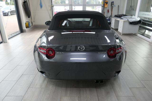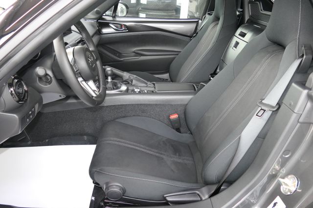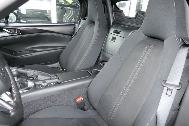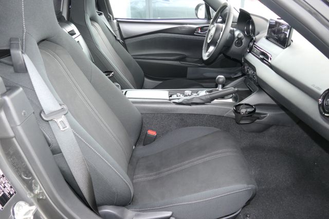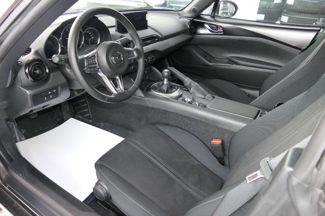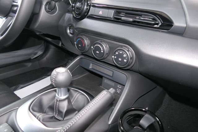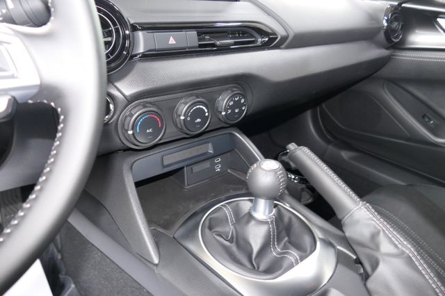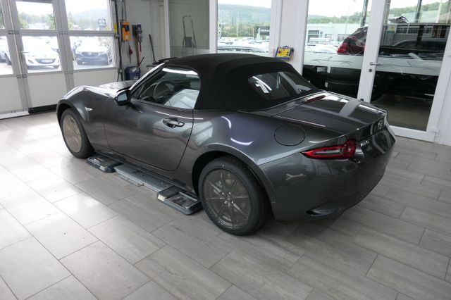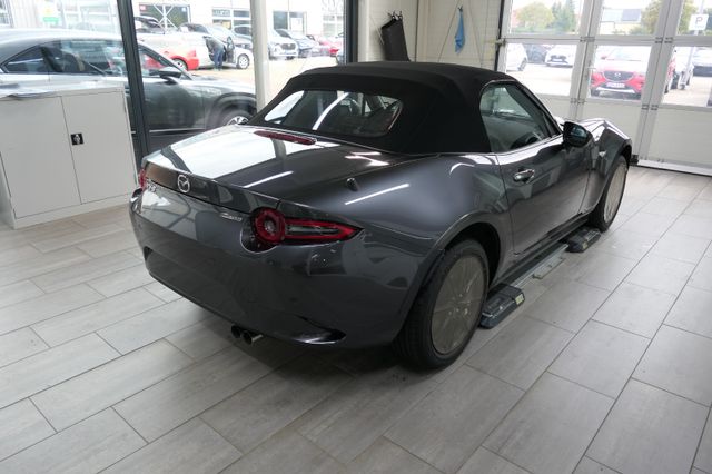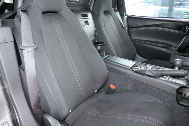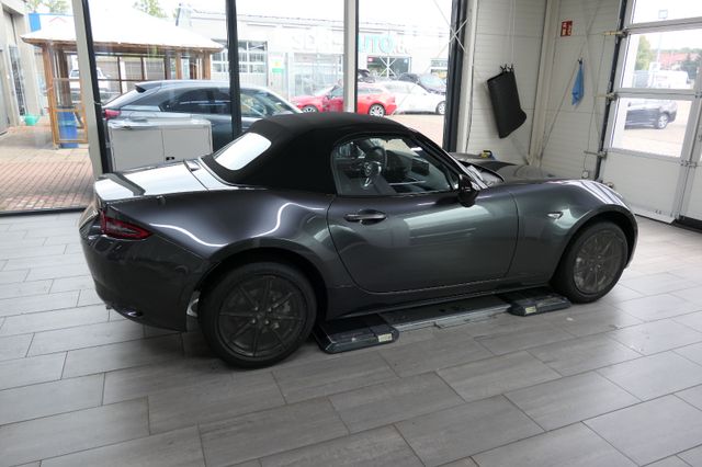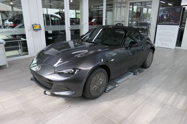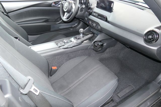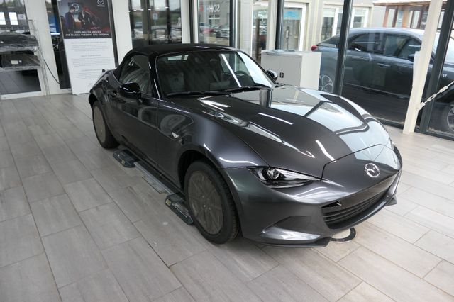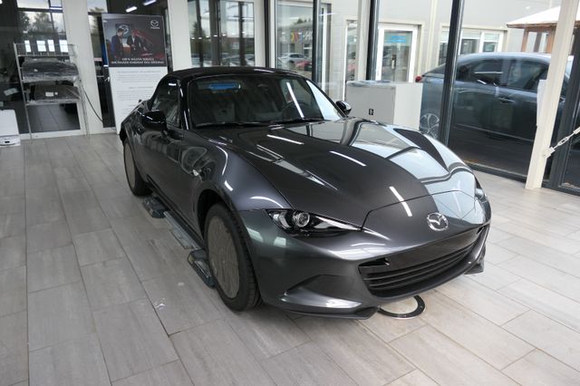 3-Speichen-Sport-Lederlenkrad, Beifahrersitz höheneinstellbar, Klimaanlage, Lederschaltknauf, Lenksäule höheneinstellbar, Lenksäule längeneinstellbar, Mittelarmlehne, vorne, Sitzlehne für Fahrer- und Beifahrersitz neigungsverstellbar, Sitzfläche für den Fahrersitz neigungsverstellbar, Sonnenblende mit Make-up-Spiegel für Fahrer und Beifahrer, Zentralverriegelung mit Funkfernbedienung, 3. Bremslicht, hochgesetzt, beheizbare Außenspiegel, Einparkhilfe, hinten, Komfortblinkfunktion, LED-Tagfahrlicht, Notbrems-Warnblinkautomatik (ESS), Regensensor, Stoffverdeck in Schwarz, Voll-LED Scheinwerfer, Beifahrerairbag abschaltbar, City-Notbremsassistent (SCBS), Dynamische Stabilitätskontrolle (DSC) mit Traktionskontrollsystem (TCR), Frontairbags; Seitenairbags mit integriertem Kopf-/Schulter-Schutz, Geschwindigkeitsbegrenzer mit Komfortschaltung, Geschwindigkeitsregelanlage mit Geschwindigkeitsbegrenzer, ISOFIX® Kindersitzhalterung auf dem Beifahrersitz, Mobilitäts-Kit mit Kompressor und Reifendichtmittel, Müdigkeitserkennung (DAA), Notbremsassistent (SBS), Reifendruckkontrollsystem, direkt (TPMS), Spurhalteassistent (LAS) mit Lenkunterstützung, Verkehrszeichenerkennung (TSR), Warnleuchte und -ton für nicht angelegte Sicherheitsgurte, Wegfahrsperre, elektronisch, Mazda Connect mit 2 USB-C-Anschlüssen, Mazda Navigationssystem, Sound-System mit 6 Lautsprechern und 22,3 cm (8,8 Zoll) Multimediadisplay, in Verbindung mit Android Auto™ und Apple CarPlay® als Touchscreen nutzbar, Wireless Apple Carplay® und Wireless Android Auto™